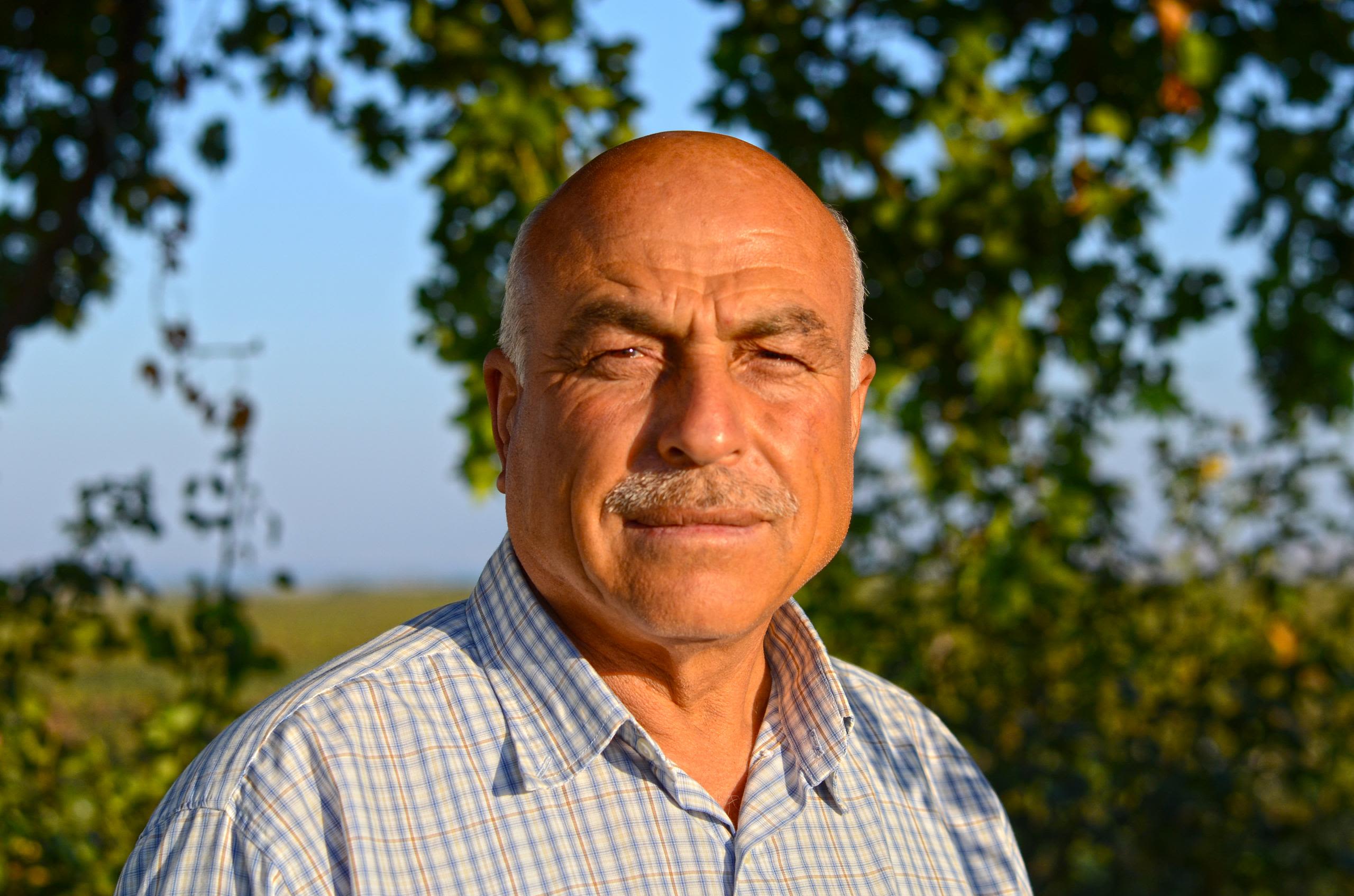 Permanent farm-worker, Mehmet Kiliç, wearing one of the sun hats.